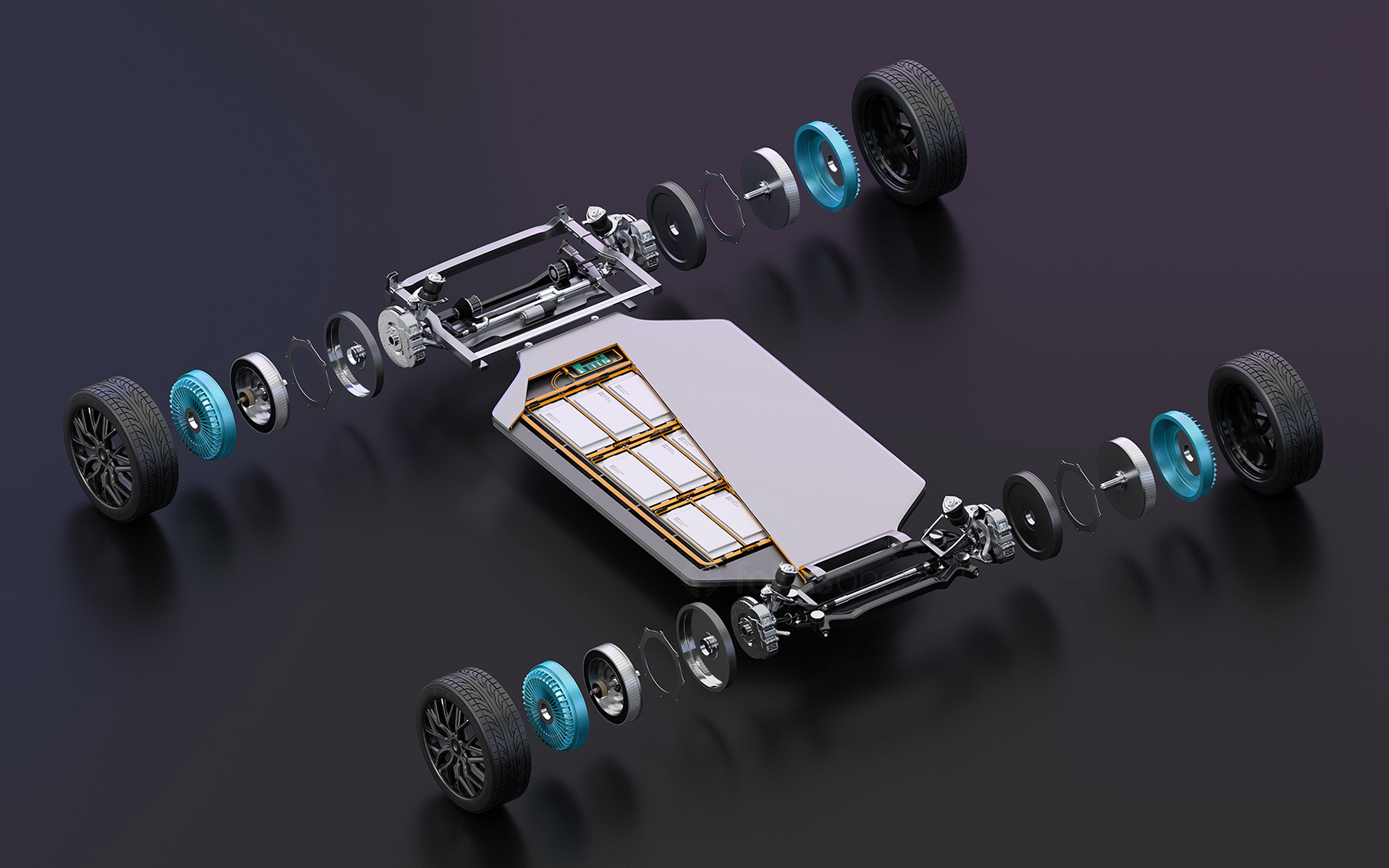 Technical Drawing of In-Wheel Motor. The electric vehicle equipped with Solid-State battery modules.